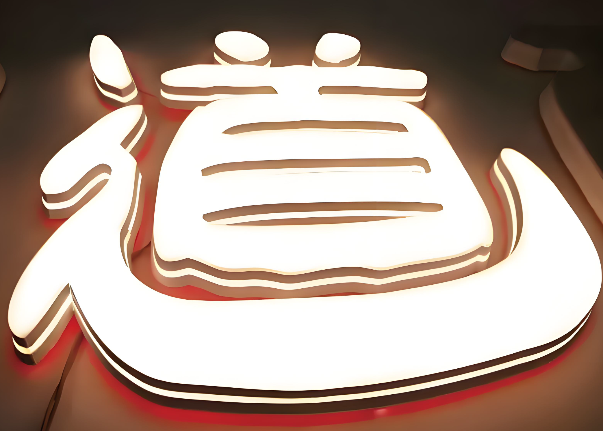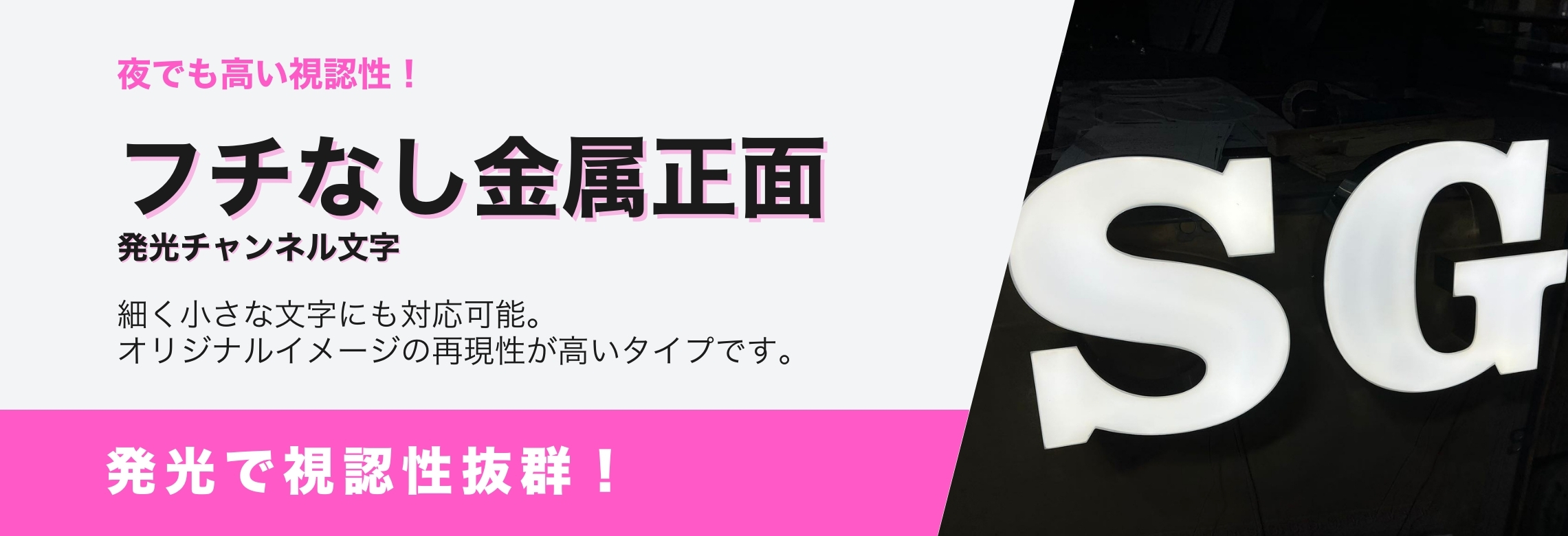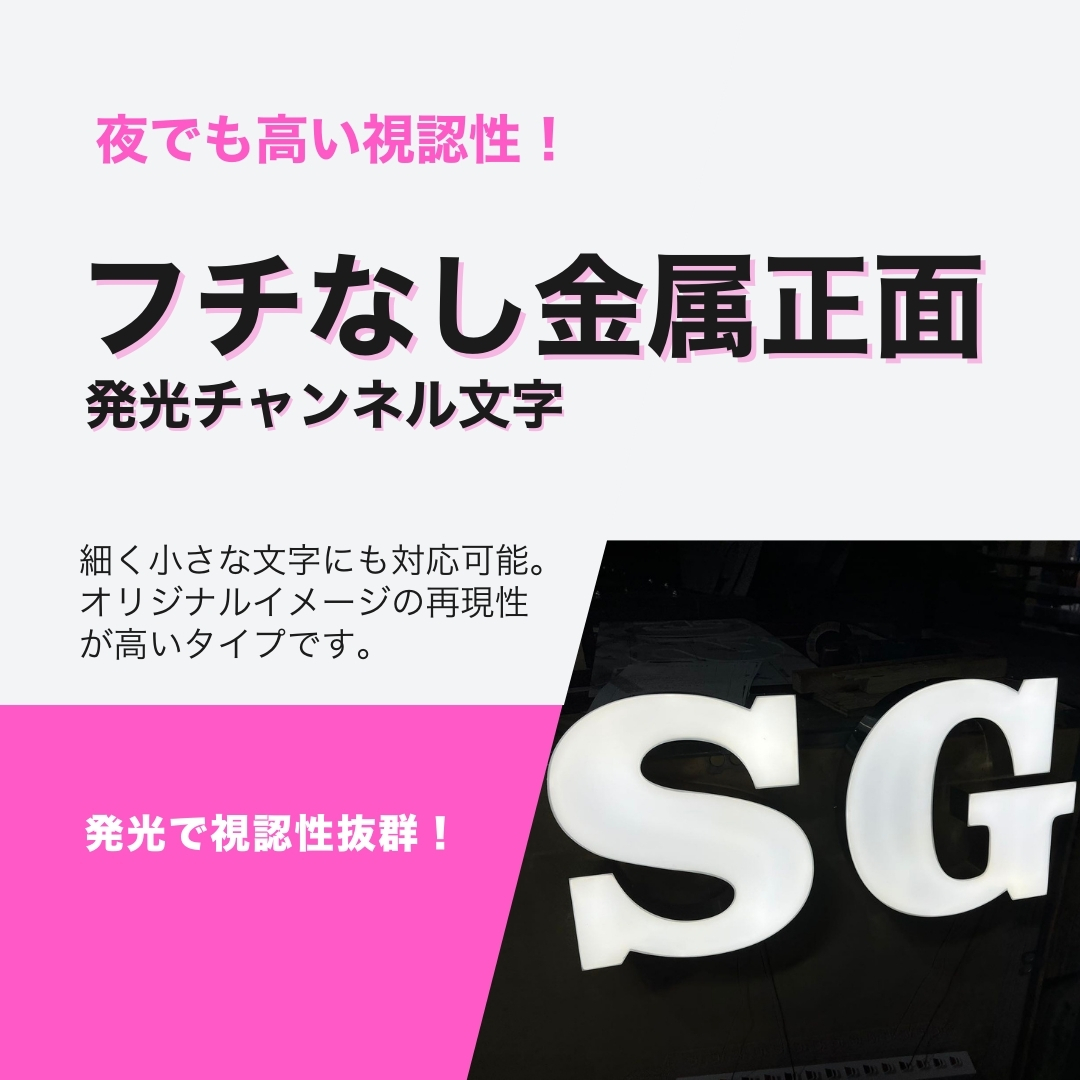 フチなし金属正面発光チャンネル文字は、エレガントでモダンなデザインを追求したい場合に最適なサインです。このタイプのチャンネル文字は、フチを持たず、金属の高級感と正面からの美しい発光を組み合わせた特徴があります。シンプルで洗練された見た目に仕上がるため、企業ロゴや店舗サインなど、目立たせたいシンボルに効果的です。金属の強度と耐久性を備えつつ、発光部分が文字全体を鮮やかに照らし、夜間でも視認性を 高めます。