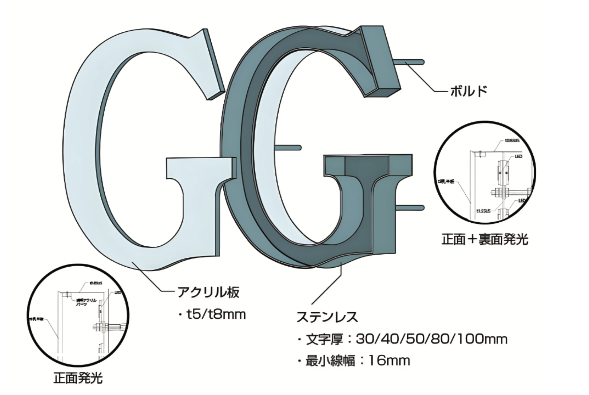 フチがないことで、文字全体が軽やか に見えつつも、金属の質感からくる高級感を損なうことなく表現できます。