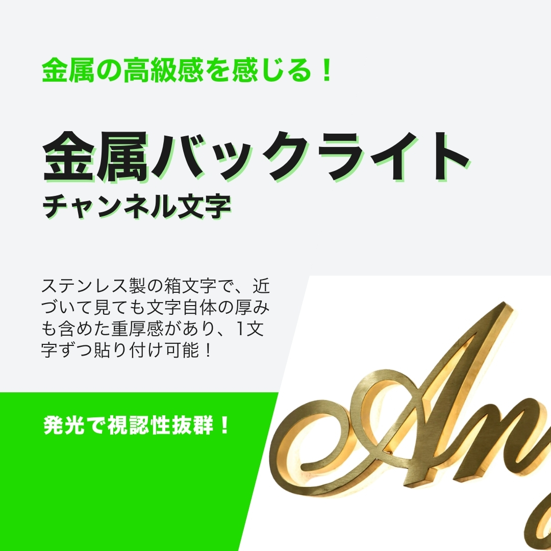 「金属バックライトチャンネル」とは、主にサインや看板の製作において使われる技術やデザインの一種です。この技術を用いることで、金属製の文字やロゴの背面に照明を配置し、背面から光を放つことで、文字やロゴが浮かび上がるように見せることができます。
