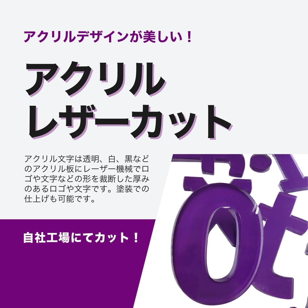 アクリルレーザーカットは、アクリル素材をレーザーで精密に切り抜いて作 成する技術で、サイン、ロゴ、装飾品など幅広い用途に使用されます。アク リルの美しさとレーザーカットの正確さが組み合わさることで、デザイン性の高いアイテムが作成できます。以下がアクリルレーザーカットの特徴です 。