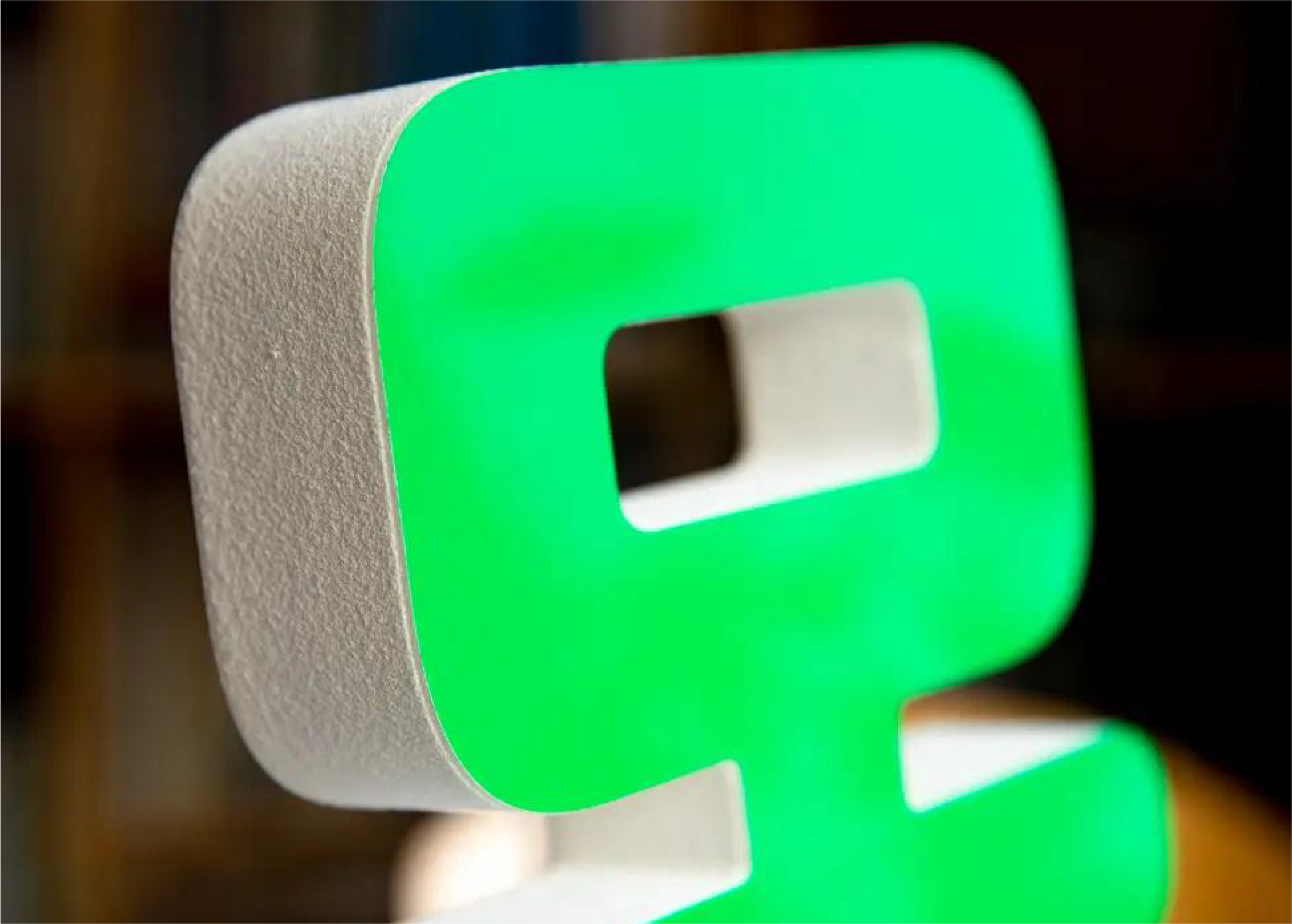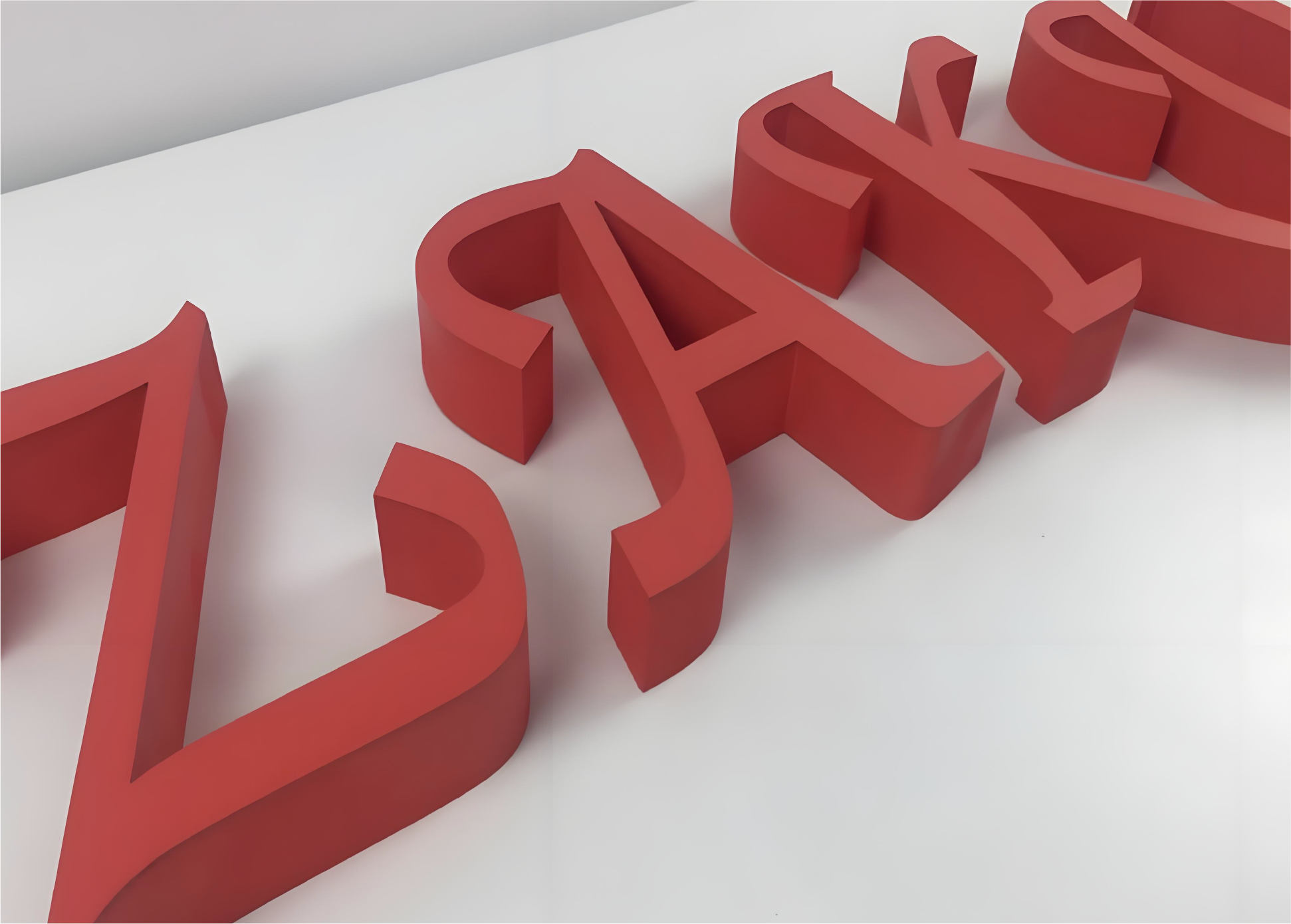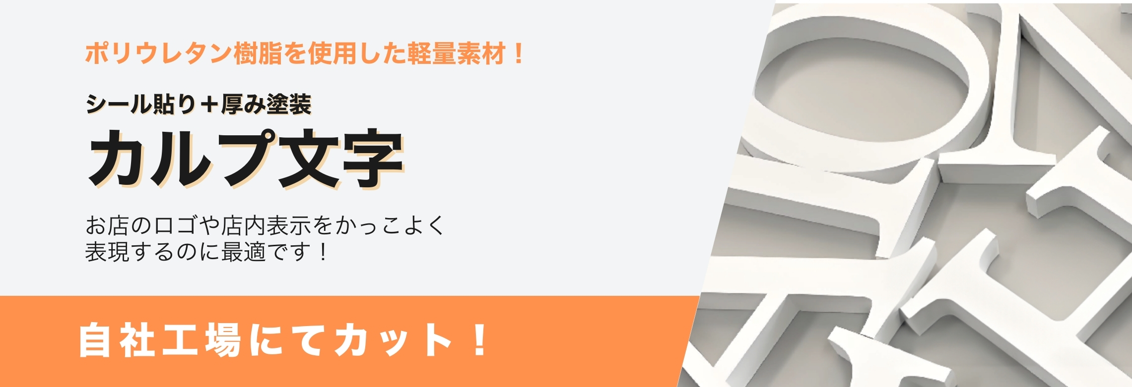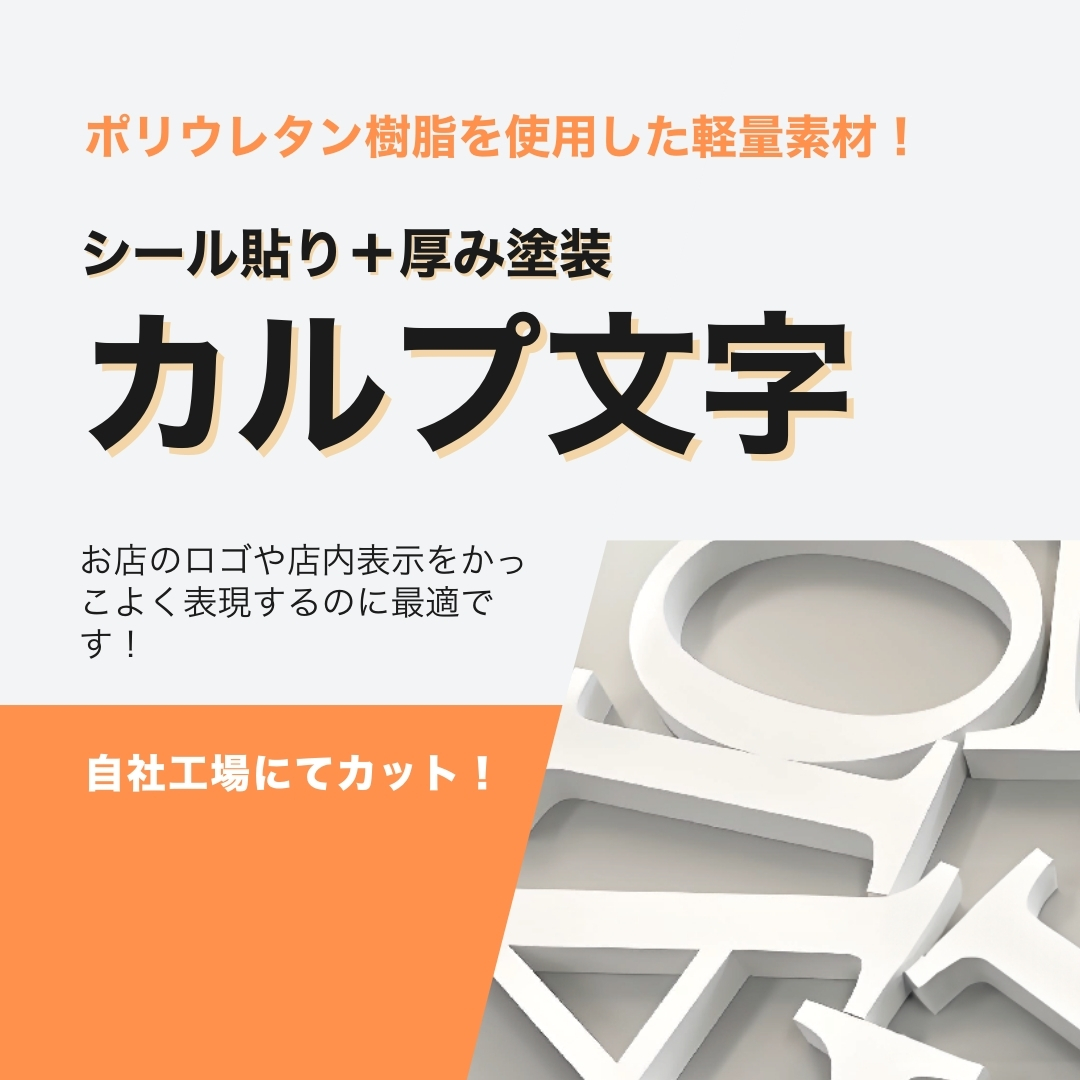 カルプ文字は、ポリウレタン樹脂を使用した軽量で立体的なサイン用 の文字です。その特徴的なデザインと加工のしやすさから、看板や店 舗サイン、ロゴ表示などさまざまな場所で使用されています。