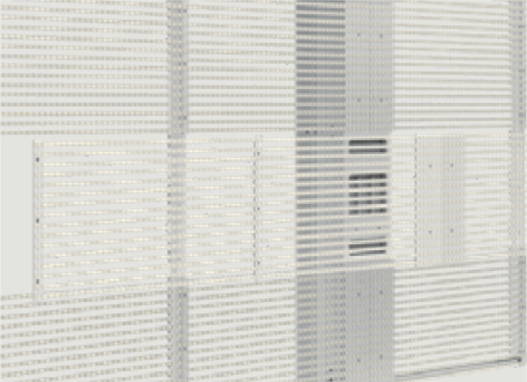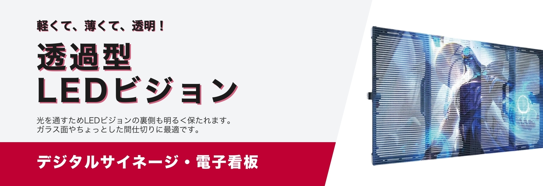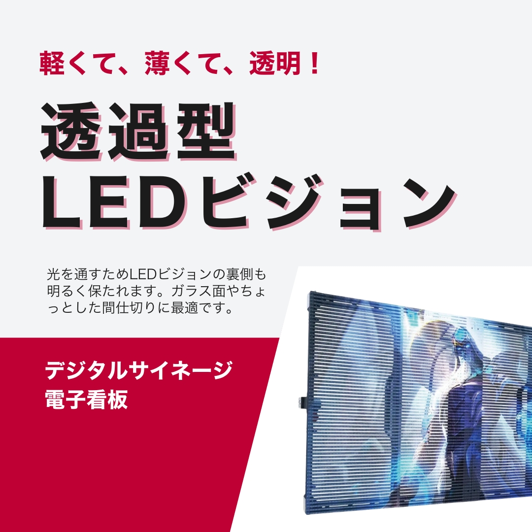 メッシュLEDビジョンは正面から見たら普通のLEDビジョン同様に映像コンテンツを見ることができるのに、内側からは、外の景色を眺めることができる、透過性のあるLEDビジョンのことです。ガラス面に設置することで、外の景色や採光を遮ることなく、映像を投影しての映像PRを行うことができます。