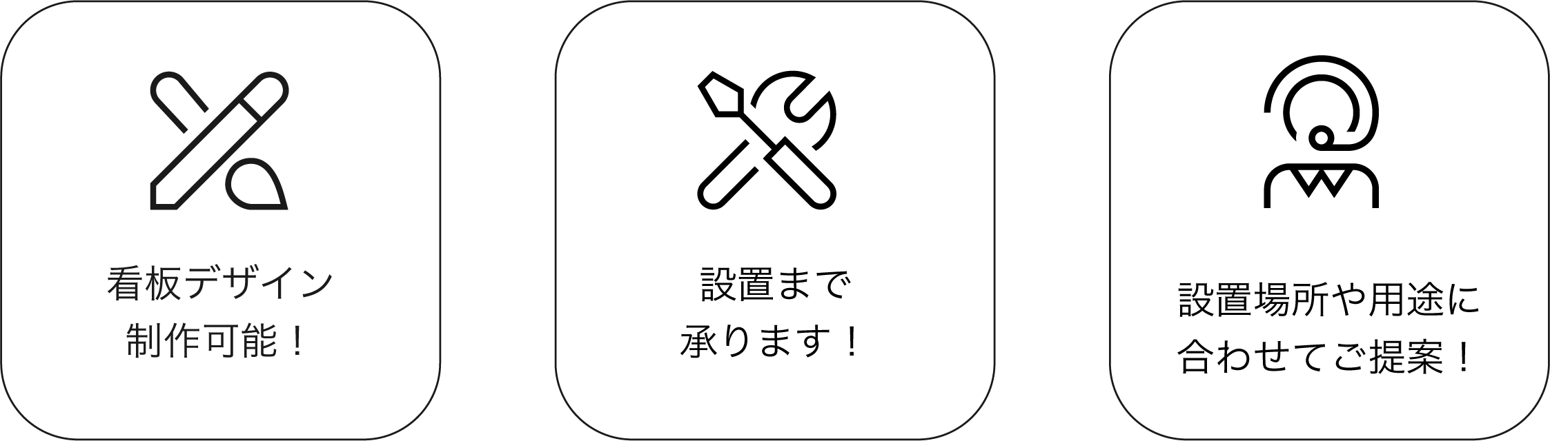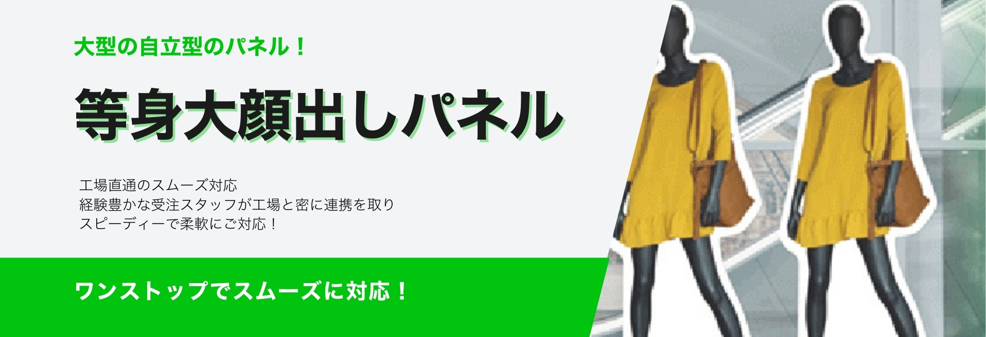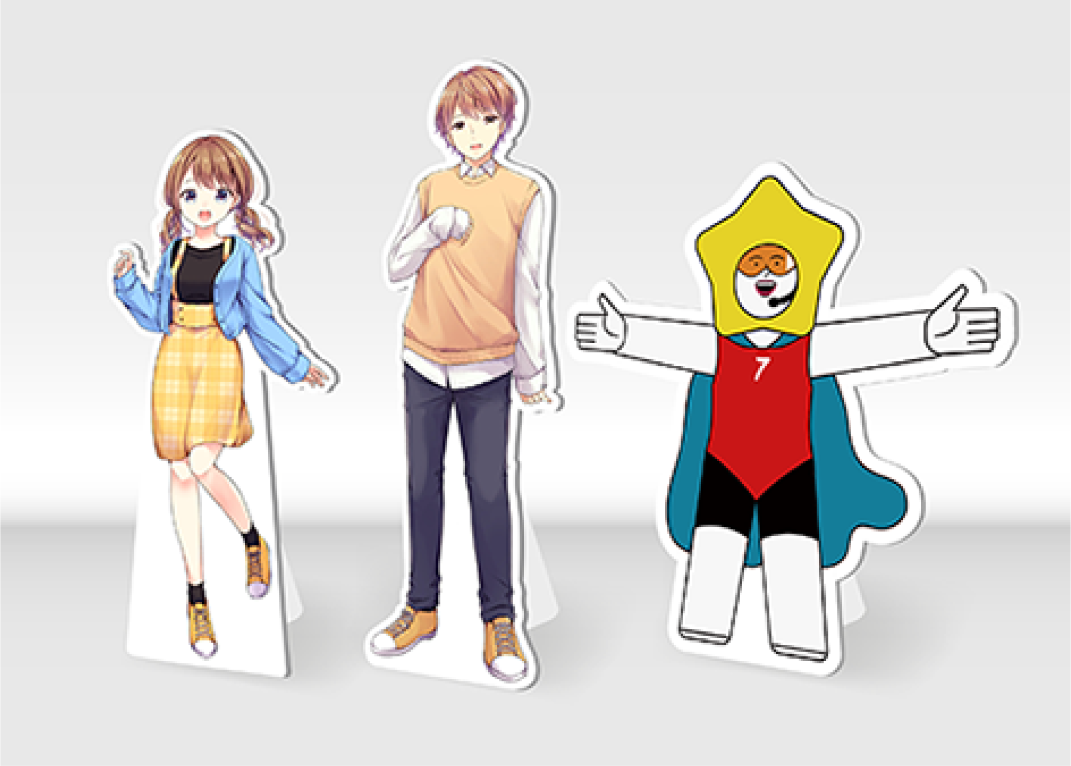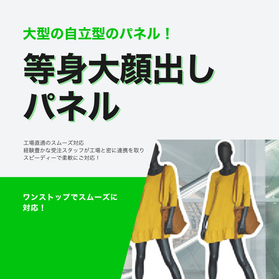 商品カテゴリ パネル看板 - アルミ複合板製プレート 看板 - 即製デザインプレート看板 - 等身大パネル/等身大ポップ/顔抜き/顔ハメ アパート/マンション銘板 - ステンレス銘板 - アクリル銘板 - 木銘板 看板用シート印刷 - カティングシート - インクジェット出力 - UV印刷 - マグネットシート - ターポリン印刷 チャンネル文字 - 樹脂文字3Dプリンター文字 - 表面+裏面発光チャンネル文字 - フチなし金属正面発光 - フチあり金属正面発光 - 金属バックライトチャンネル文字 切り文字 - アクリルレザーカット文字 - 硬質塩化ビニール(PVC)/ 板切り文字(シール貼り) - カルプ文字(シール貼り+ 厚み塗装) - 金属切り文字/箱文字 - 木の切り文字 スタンド看板 - A型看板 - 袖看板 - 捨て看板(木製) - アクリル電飾看板 - 電飾スタンド看板 レンタルLEDビジョン - レンタル屋内スタンドLEDビジョン - レンタル屋外スタンドLEDビジョン LEDビジョン - 屋外スタンドLEDビジョン - 屋内スタンドLEDビジョン - 透過型LEDビジョン - 異形LEDビジョン - LEDデジタル看板 Product introduction 商品紹介 等身大パネルや等身大ポップは、実物大の人間やキャラクター、商品などのイメージをプリントして立てられるディスプレイです。特に注目を集めたいイベントやキャンペーンで使用されることが多く、以下のような特徴があります。 ・実際の人物やキャラクターのサイズ感を再現 ・プロモーションやブランディングに最適 ・軽量で設置が簡単。 多数のサイズを選択できます! お見積もり依頼 ご希望の提出期限 個人情報の取り扱いについて(必須) 当社の個人情報保護方針に同意して送信する。 Send