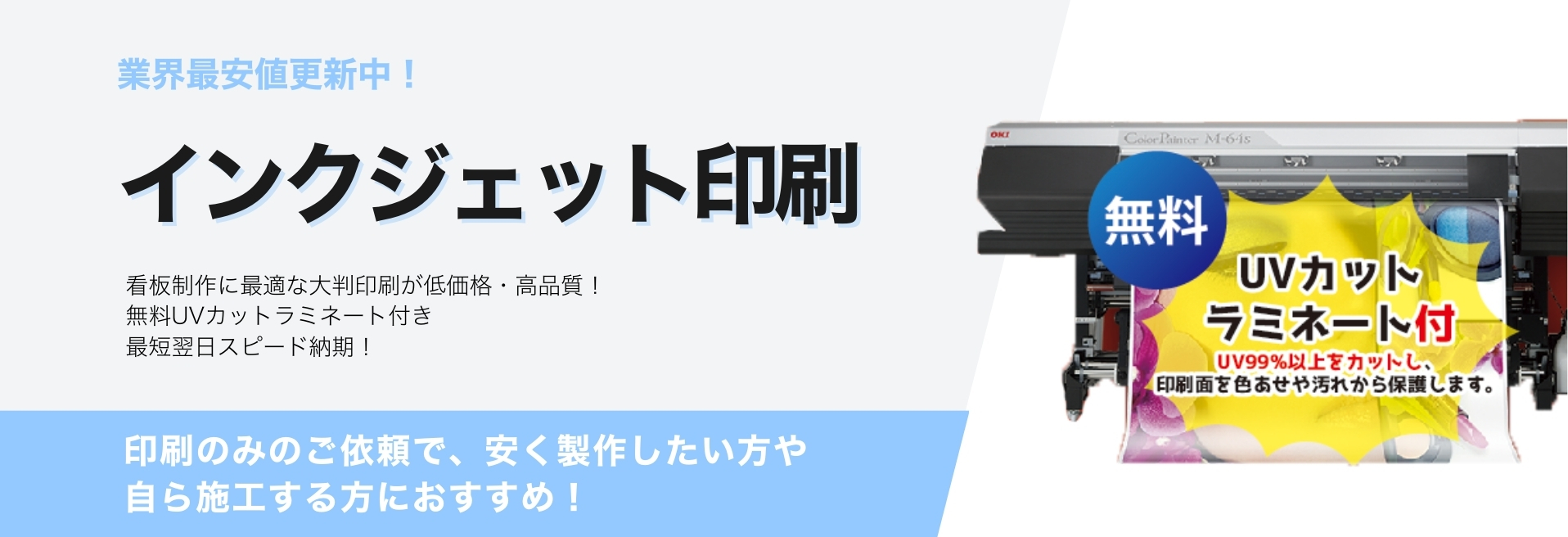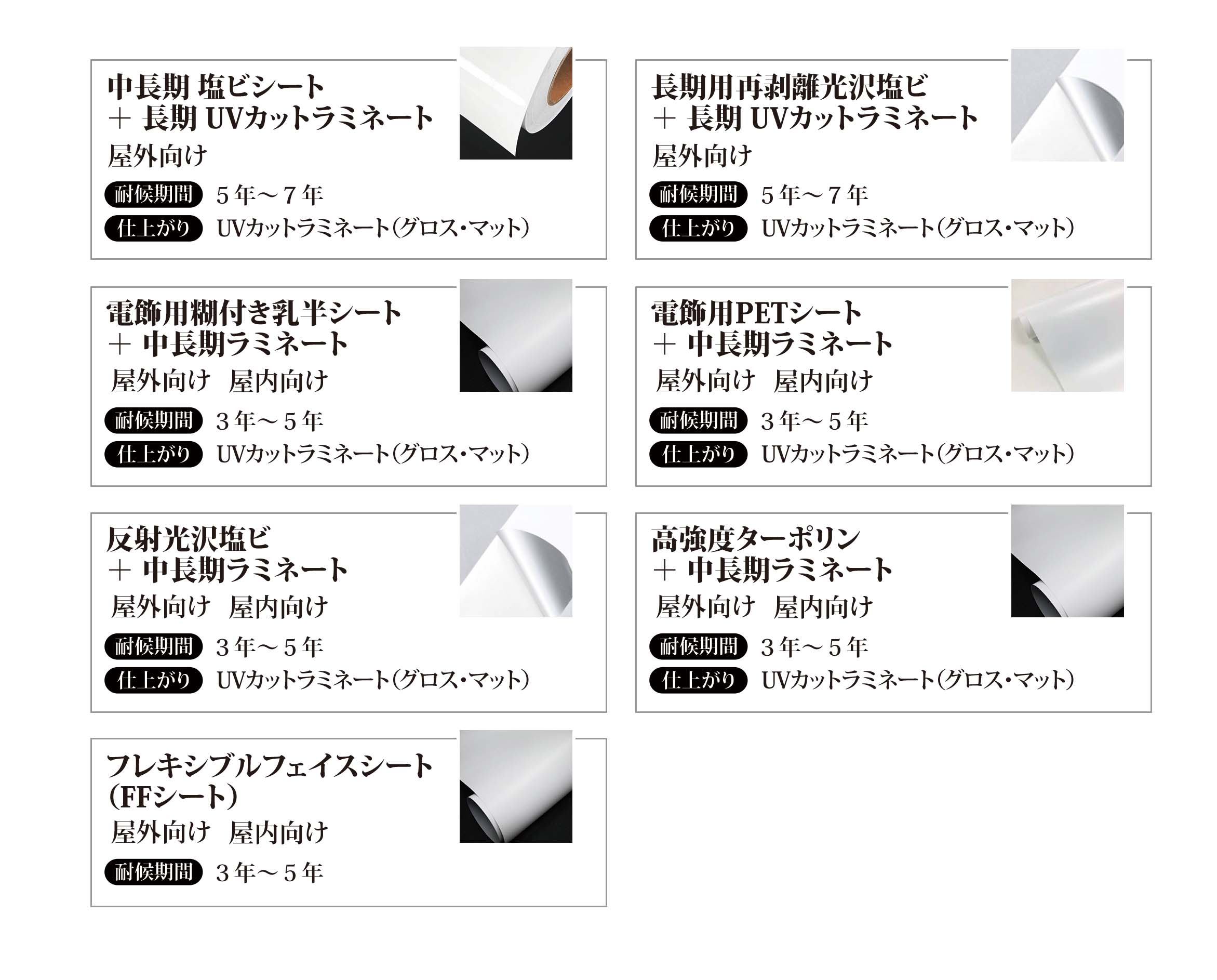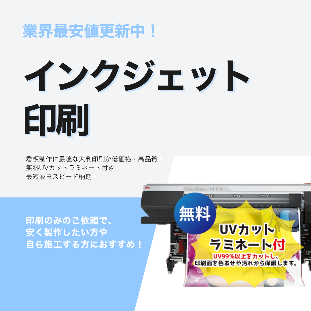 ・塩ビ素材(短期用、長期用、電飾用、反射素材)はUVラミネ ート加工無料です。