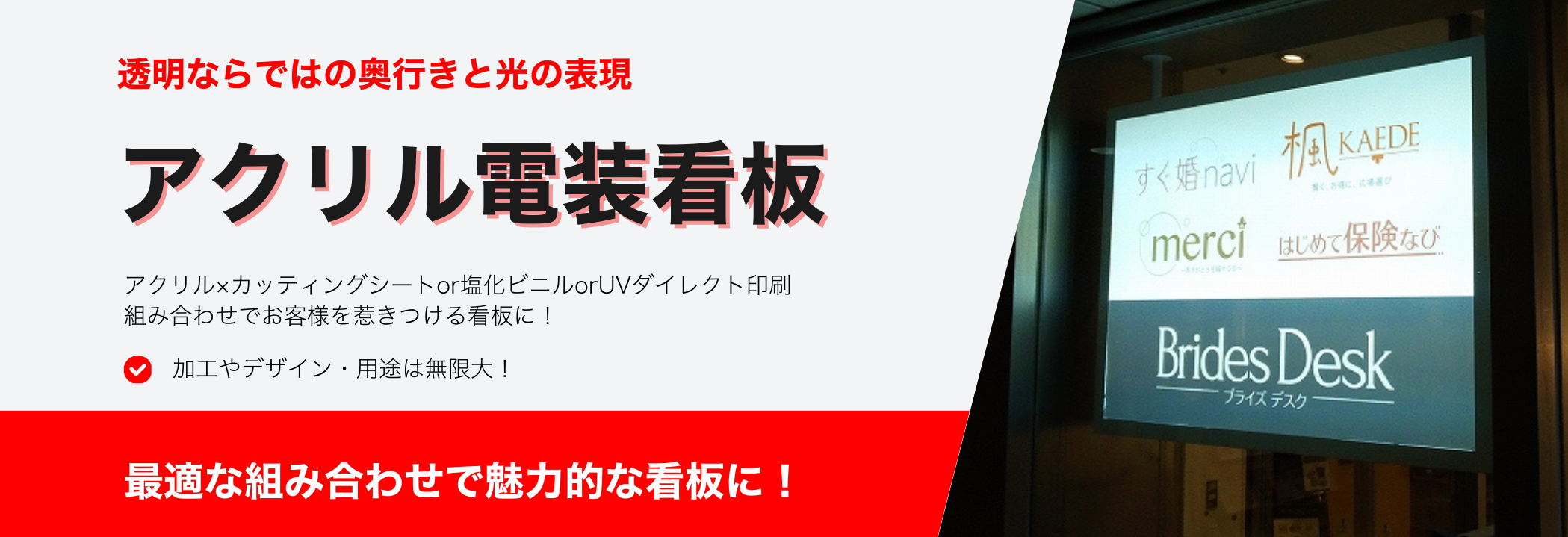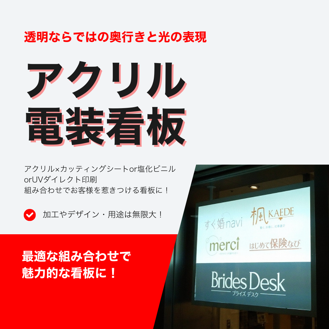 アクリル電飾看板とは、アクリル素材を使用した看板で、内部にLEDや蛍光灯などの照明を組み込んだ電飾サインです。夜間や暗い場所でも看板自体が発光するため、視認性が高く、店舗や施設の存在感を強調するのに最適です。